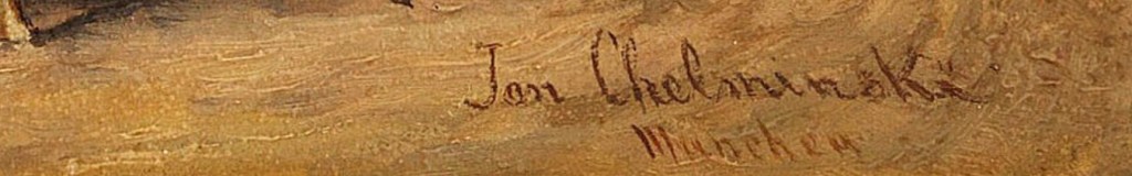 Obraz ten jest tak podłej jakości malarskiej, że zacząłem zastanawiać się czy go przedstawić na blogu czy też nie. Odnalazłem jednak pierwowór tej pracy sprzedany w 2018 roku w niemieckim Neumeister https://polishartcorner.com/2019/07/22/jan-chelminski-1851-1925-15/. Nie słyszałem by Jan Chełmiński malował repliki swoich prac, nawet we wczesnym swoim okresie malarskim w Monachium. Niech każdy sobie wysnuje wniosek porównując obie prace o niemal identycznych wymiarach – warto popatrzeć na fotografie dobrzej rozdzielczości. ‘Zopfy’ chętnie malowali w pewnym okresie wielcy polscy monachijczycy i nic złego mieć na płótnie wyfryzowanych paniczyków na koniach spędzających czas na polowaniach. Gorzej, kupić słabą i wytartą kopię.