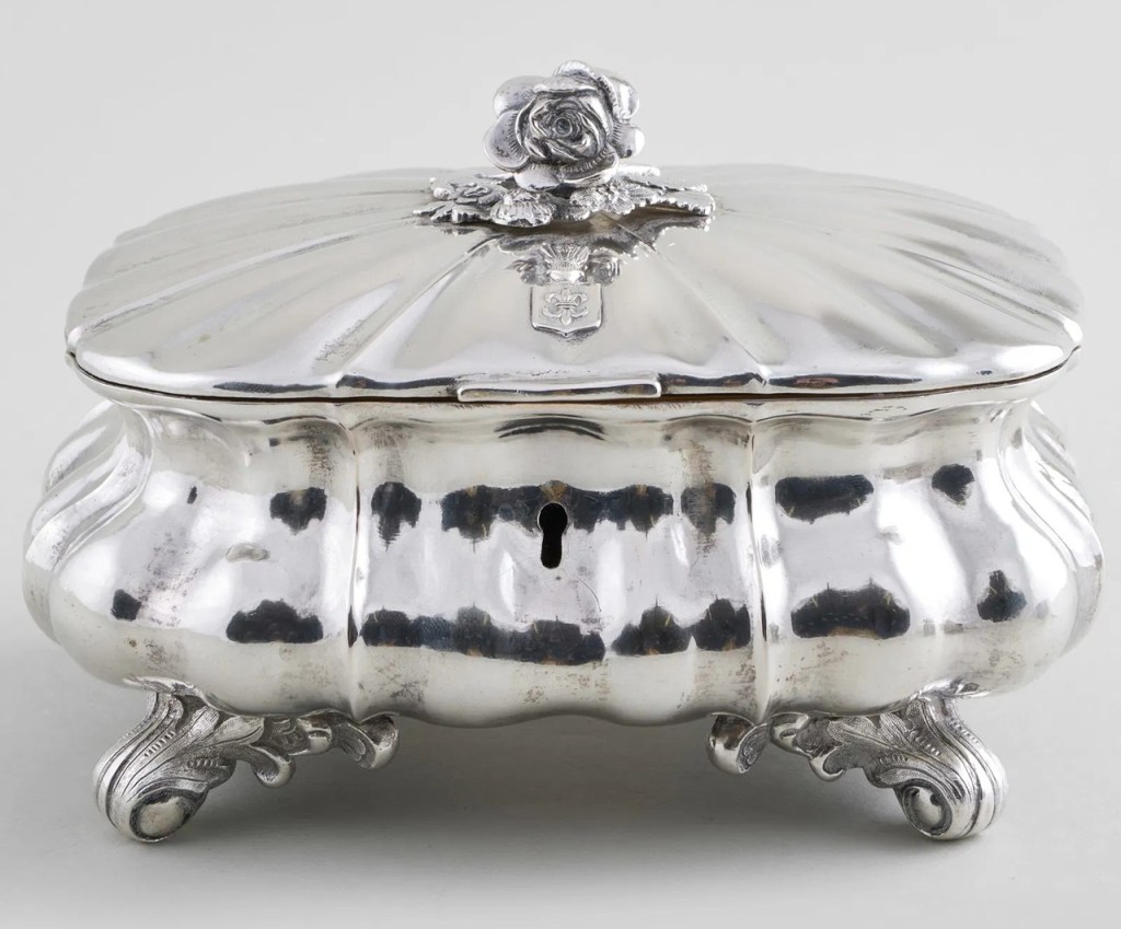 Lot 581. Continental Silver Sugar Box and Two Table Boxes. Comprising: A sugar box, indistinctly markedl; A table box repoussed with a battle scene, indistinctly marked; A Dutch table box, marked ‘.830’; The sugar box 4 1/2 x 7 x 5 1/2 in., 47.6 oz. approx. gross weight. Collection of Jan Mitchell. Estimate $500-$700. Stair. 08/07/25. Sold $1,200