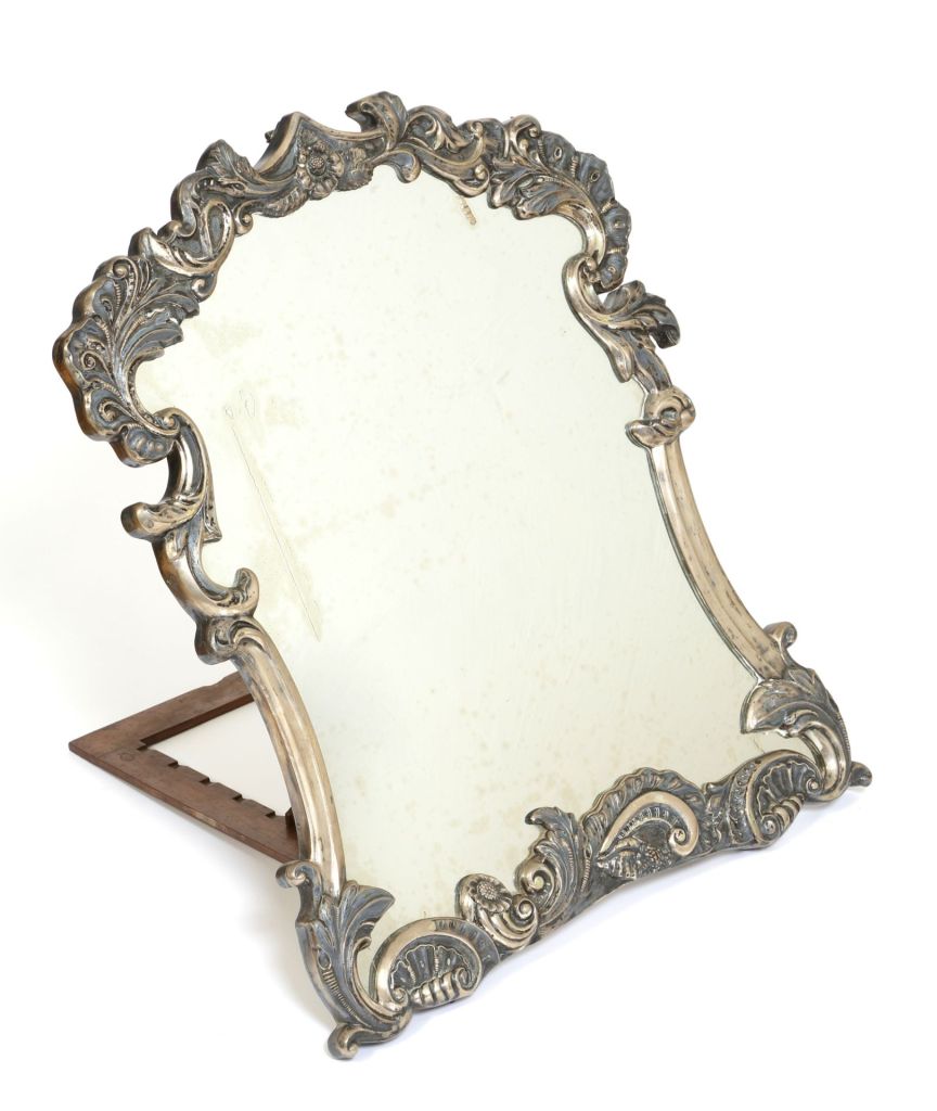 Lot 814. Wand- und Standspiegel, Polen, um 1900, geschweifter Holzrahmen mit im barockisierenden Stil gestalteter 12 Lot Silberauflage, mit original Klappfuß, gepunzt: MZ: Beschau: Anker und ‘Warsavie’ (ca. 1840-60) MZ: Malez (Siehe: Marc Rosenberg, Der Goldschmiede Merkzeichen, IV. Band, S. 452), H: 60 cm, B: 48 cm. Limit 180,-. Dawo Auktionen. 07/26/28. Sold €1,800.