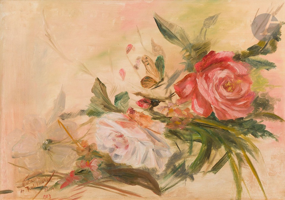 Lot 181. Vladimir TERLIKOWSKI (1873-1951). Roses, 1903. Oil on canvas. Signed and located Dieppe lower left. (Restorations). 46 x 65 cm. Estimate €600 – 800. Ader. 09/30/25. Sold €1,000