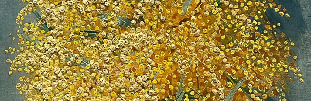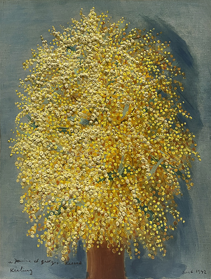 Mimozy tytaj przedstawione powstały w czasie pobytu Mojżesza Kislinga w czasie II wojny światowej w USA. Obraz ma bezsprzeczną proweniencję, bardzo wyróżniającą się fakture (powiększenie obrazu powyżej) i dlatego oczekiwania na wysoką sprzedaż są w Hong Kongu bardzo wysokie. Znanych jest wiele martwych natur tego artysty, ktorych głównym motywem są mimozy. Nie wszystkie jednak mają jednak uzanie w oczach Marca Ottaviego i dlatego należy być ostrożnym. Jeden z takich właśnie obrazów przechodził w ostatnich latach z domu aukcyjnego do domu aukcyjnego, z jednego państwa do drugiego państwa (https://polishartcorner.com/2024/12/09/mojzesz-moise-kisling-1891-1953-93/) i wygląda, że każda ze sprzedaży byłą wątpliwa.