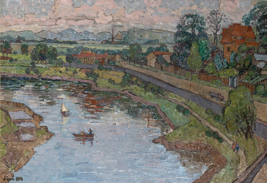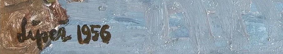 Lot 82. Romana Lipeż Polish, 1917-2003. View of a Town by a River, 1956. Signed and dated Lipeż 1956 (ll). Oil on canvas, 27 1/4 x 39 1/4 inches (69.2 x 100 cm). Estimate $400 – 600. Doyle. 10/28/25. Sold $500