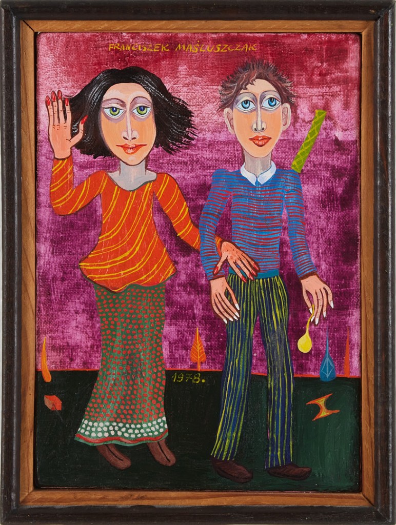4617746. FRANCISZEK MASLUSZCZAK (FÖDD 1948). Man and Woman, oil on canvas affixed to panel, signed and dated 1978. 21×15, frame dimensions 25×18 cm. Estimate €550. Stockholms Auktionsverk. 11/01/25. Sold €409