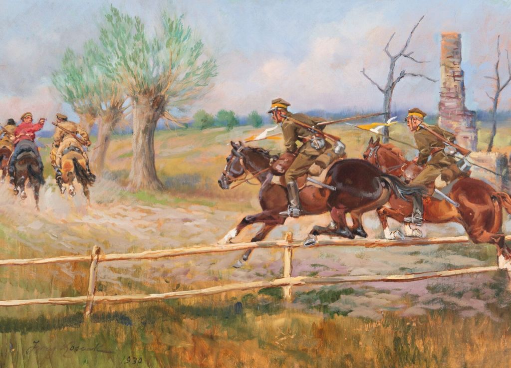 Lot 120. Jerzy Kossak (Polish, 1886-1955). Chasing the Bolshevik, 1930, oil on canvas signed Jerzy Kossak and dated (lower left) 19 3/8 x 27 1/4 in. (49.2 x 69.2cm). This lot is located in Philadelphia. Framed: 27 1/4 x 34 1/4 x 3 in. Estimate $4,000 – 6,000. Freeman’s. 11/04/25. Sold $5,500