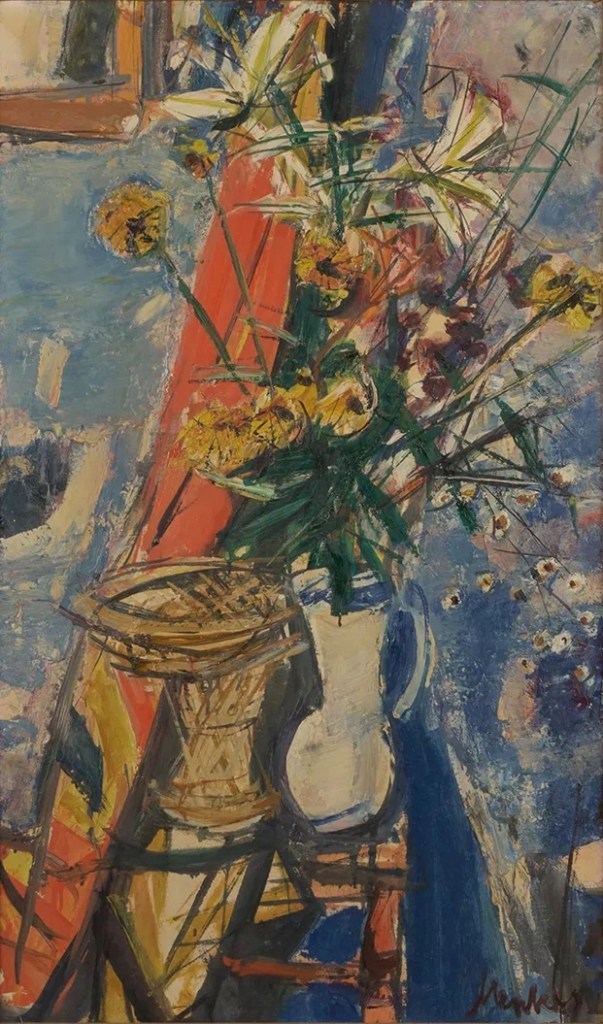 Lot 452. Sigmund Menkes (1896-1986): Flower Bouquet. Oil on canvas, signed ‘Menkes’ lower right, with label from Rudolph Galleries, Woodstock, NY. 32 x 19 in., 41 x 27 1/2 in. (frame). Estimate $2,000 – 4,000. Stair. 11/20/25. Sold $9,000