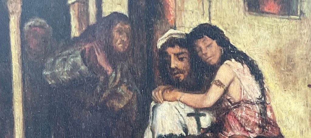 Maurycy Gottlieb ? Couple in an embrace within a historic architectural courtyard