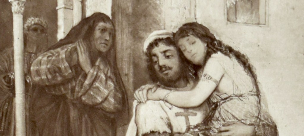 Maurycy Gottlieb (1856-1879), Uratowanie Rechy, 1876, rotograwiura, papier; 21,3 x 15,3 (wymiar kompozycji); Reprodukcja obrazu olejnego z 1876 roku; Ilustracja z publikacji „Maurycy Gottlieb 1856-1879: 26 reprodukcji według obrazów mistrza”, wydanej w Wiedniu w 1923 roku. (Warszawski Dom Aukcyjny). 10/20/2020
