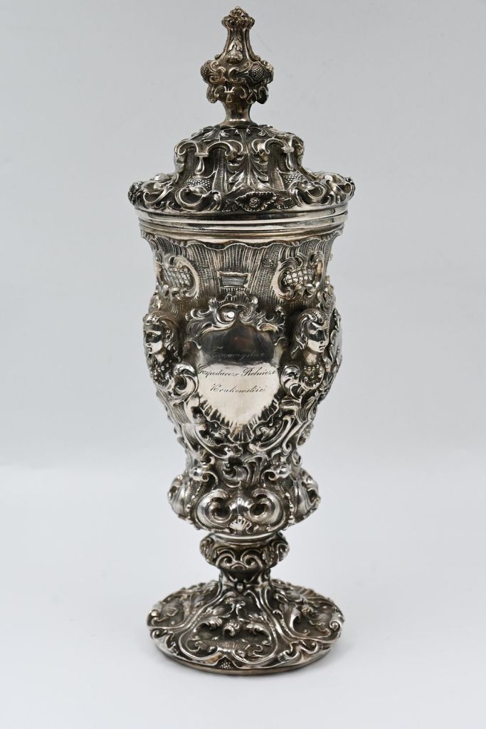 Lot 4. A magnificent silver goblet with a lid, Alt-Vin, 1851. The inside of the lid is golden. Decorated with hammer work and relief – on one side a noble emblem of the Salpobron family and on the other an agricultural scene. Inscribed “Economic and Agricultural Society of Cracow” as well as “First President Vincent Drobskiy” dated 1852. Stamps, artist’s stamp. Dimensions: height (including lid) – 34 cm, weight – 911 g. Condition: cover slightly bent and dents in the body. Starting $3,000. Behrooz. 01/28/26