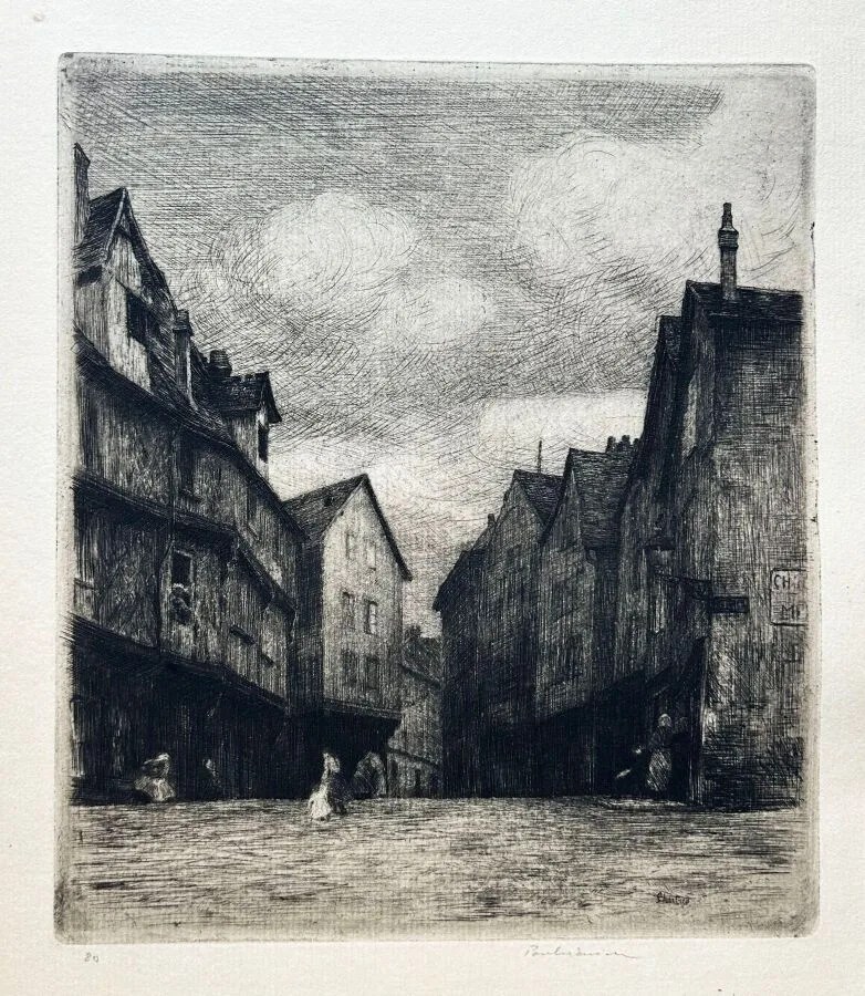 Lot 250. Jozef PANKIEWICZ (1866 – 1940, Polish artist) – “Place de la Poissonerie (à Chartres)“. 1903. Original etching. “Chartres” engraved in the plate in the lower right-hand corner. Fine proof on cream laid paper, numbered 80 and signed in pencil by the artist. Louis Fort publisher’s stamp truncated in lower right margin. Margins. 32.5 x 25 cm. Condition A (well preserved). Estimate €300 – 400. Eric Caudron. 01/27/26