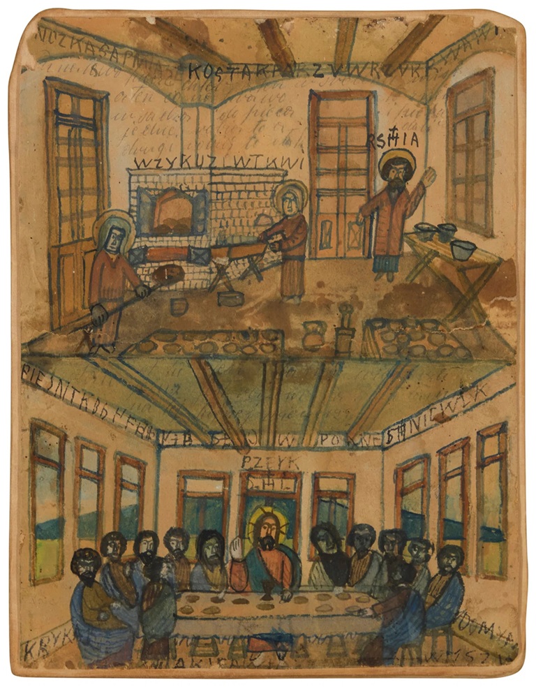 Lot 2181. Nikifor Krynicki (1895-1968). The Last Super. Mixed media on paper. Appears unsigned; inscribed in Polish throughout. Image/Sheet: 11.5″ H x 8.5″ W. Light-staining and toning throughout. Two 2″ horizontal tears at the center of both the left and right edges that have seemingly been backed, and other even smaller edge tears scattered throughout. A few small paper losses scattered along the edges, primarily the upper edge. Surface soiling, damp staining, foxing, and handling marks, all scattered throughout. Other lesser defects. The sheet is framed floating, affixed to the back mat. Estimate $1,000 – 1,500. John Moran Auctioneers. 02/04/26