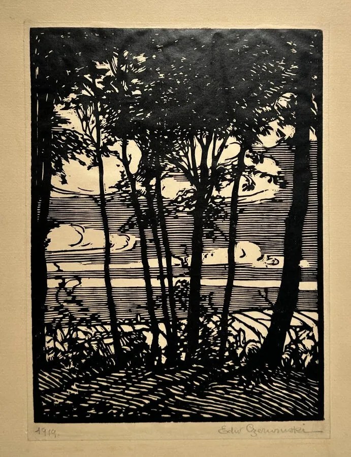 Lot 202. Edward CZERWINSKI (1892 – 1966, artiste polonais) – [Paysage, arbres]. 1919. Bois gravé. Epreuve sur papier fin collé par les bords sur un vélin crème, datée et signée au crayon par l’artiste. Marges. 22 x 16 cm pour le sujet. 33,5 x 27,2 cm le tout. Etat A (papier de support légèrement insolé, sujet en bon état). Estimate €150 – 200. Eric Caudron. 03/25/25