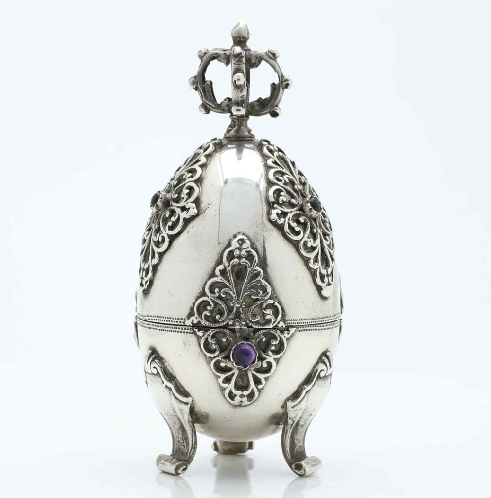 Lot 4889666. A silver egg, checkmaster Józef Sosnkowski (1869-1896), Warsaw, 1878. Richly decorated egg on three feet, inlaid semi-precious stones, cover crowned with crown. Interior motif of kneeling woman with stone in hand. Height 11 cm. Width approx. 4.5 cm. Weight 127 grams. Usage and age-related wear. Estimate €376. Hälsinglands Auktionsverk. 03/15/26