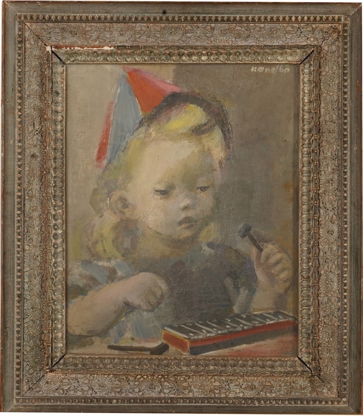 Lot 39. Rajmund (Raymond) Kanelba (Polish, (1897-1960). ‘Ann with Music‘, 1941, head and shoulders portrait of a young girl in a striped hat, playing a toy xylophone, signed upper right, further signed and dated verso, oil on canvas board, 38cm x 31cm Estimate £1,000 – £1,500. Gorringes. 03/24/26