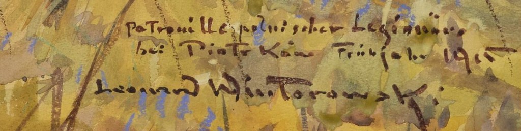 Lot 258. Leonard Winterowski (Czernowitz 1875-1927 Warschau). A patrol of Polish legionnaires near Piotrków in the spring of 1915 galloping through a birch forest, titled “Patrouille polnischer Legionäre bei Piotrków Frühjahr 1915” (Patrol of Polish Legionnaires near Piotrków in the Spring of 1915), signed Leonard Winterowski, watercolor on paper, 50 x 90 cm, mounted, framed, (Hu)