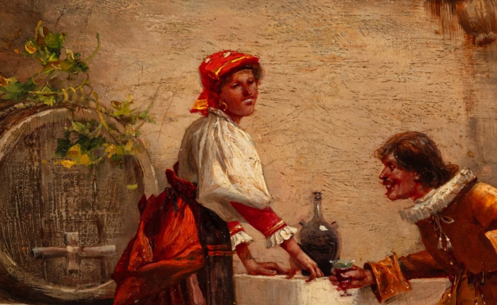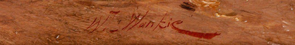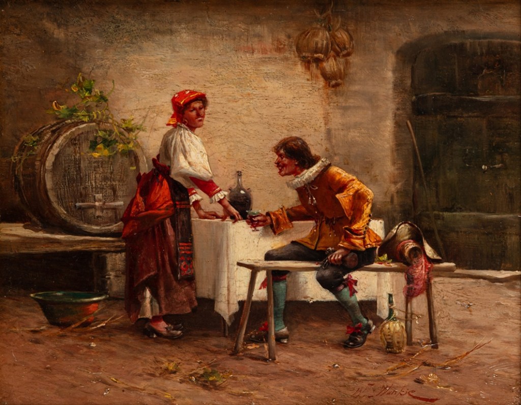 Słabiutka scenka rodzajowa “Rest at the inn” w wykonaniu Władysława Wankie, bardzo drętwo namalowana. Artysta ten był znanym i cenionym krytykiem sztuki, pisał barwne sprawozadania z wystaw, załaszcza zagranicznych i nieżle malował ale ta praca, powstała chyba nie na krajowy wówczas rynek, nie udałą mu się – kobieta swoimi do przesady białymi zębami uśmiecha się do gentlemana a ten patrzy pusto przed siebie zamiast na nią. Plastyczność twarzy obojga jest mierna. Do zalet tej pracy należy bardzo bogata, wielowarstwowa złota rama oraz pięknie położona sygnatura. Obrazek jest nisko wyceniony ale pożytek może mieć tylko handlarz bo ewentualnie dopełniająca biograficzna epistoła o malarzu podrasuje w ten sposób w kraju wartośc tej pracy.