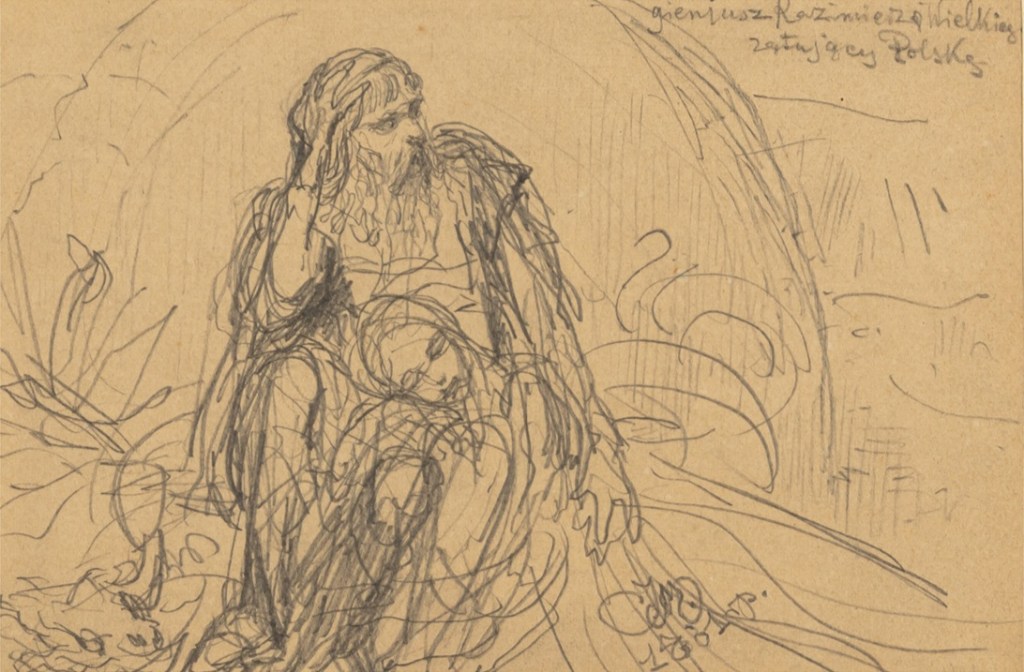 Dwa rysunki Jana Materki z których pierwszy nosi prawdopodobnie błędny tytuł bowiem w prawym górym rogu odczytuję (może z blędem) “Geniusz Kazimierza Wielkiego ratujący Polskę”. Spodziewam się zatem w przyszłości trzeciego rysunku mistrza o przypisywanym obecnie tytule. Autentyczność obu rysunków należy potwierdzić w Domu Jana Matejki w Krakowie (filia MNK).