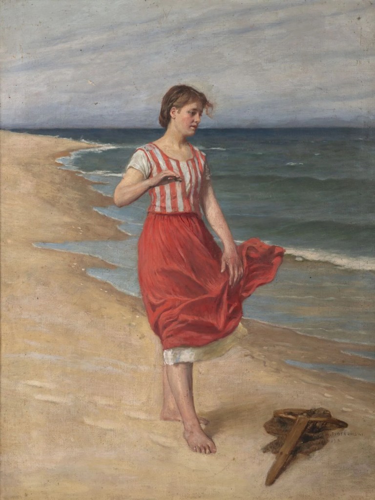 Lot 5. Antoni PIOTROWSKI (1853-1924). Young girl by the sea, 1912. Oil on canvas. Signed and dated lower right. Bears on the back, on the stretcher, an exhibition label from the “Salon Artystyczny Feliksa Richlinga” (Feliks Richling Art Salon) in Warsaw. 83 x 63 cm. Exhibition: Salon Artystyczny Feliksa Richlinga (Feliks Richling Art Salon) in Warsaw, Poland, exhibited under number “1516”, circa 1912-1914. Estimate €2,000 – 3,000. Drouot Estimations. 04/10/26