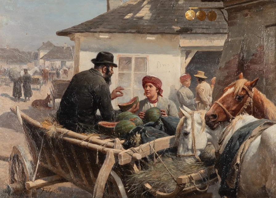 Lot 3161. THADDEUS VON AJDUKIEWICS (Polish, 1852-1916). Melon merchant. Oil on board. Signed bottom left, H. 9″ x W. 12 1/2″. Estimate C$ 6,000 – 8,000. A. H. Wilkens Auctions. 04/02/26