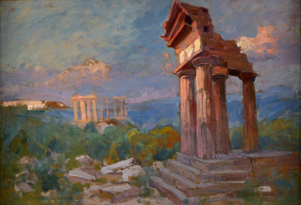 Coraz częściej daje się zaobserwować zjawisko wysyłania prac malarskich polskich artystów, które nie sprzedały na aukcjach na aukcjach w Polsce, na inne rynki europejskie. W Polsce ‘obowiązują’ bardzo wysokie wyceny i oczekiwania wysokich wyników sprzedaży. Jednak, rynek w Polsce nasycił się w ciągu ostatnich 35 lat, euforia zakupów i zysków znacznie opadła i nic dziwnego, że szuka się innych rozwiązań. Kilka przykładów ’emigracji’ prac malarskich polskich artystów na aukcje zagraniczne podawałem stosunkowo niedawno. Nowym przykładem jest powyższa bardzo dobra praca Bronisławy Rychter-Janowskiej przedstawiającej ruiny świątyni Kastora i Polluksa oraz światyni Hery na Sycylii. Obraz ten dwukrotnie znalazł się na aukcji w Sopockim Domu Aukcyjnym (2025 i 2023) i nie został tam sprzedany przy wycenie ok €4,600 – 5,800) (np: https://one.bid/en/malarstwo-wspolczesne-bronislawa-rychter-janowska-1868-krakow-1953-tamze-dolina-swiatyn-w-agrigenti-na-sycylii-girgenti-1913-r/2869054).