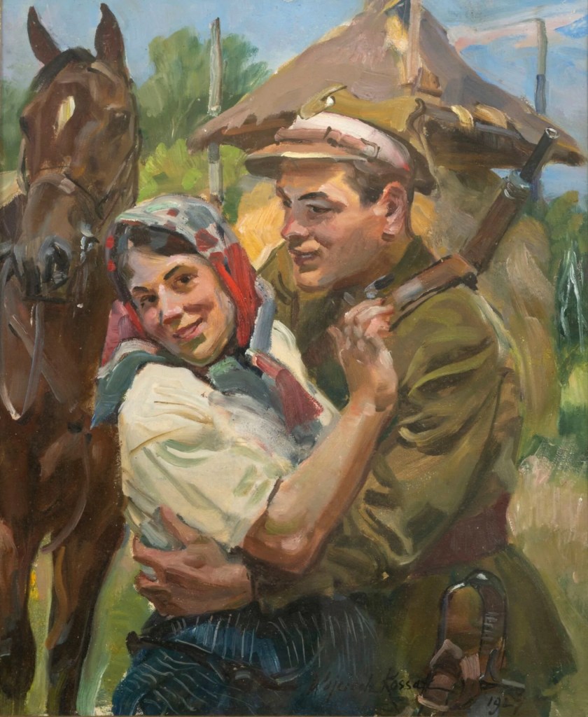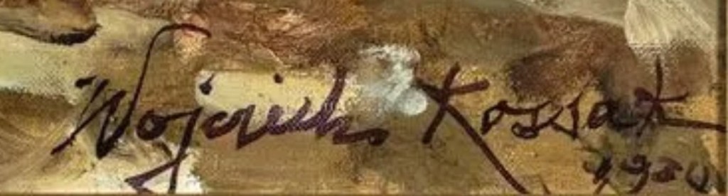 Co to będzie, gdy już wszystkie prace Wojciecha Kossaka z aukcji zagranicznych znajdą się już w Polsce? Jest ich nadal wiele, są prawdziwe i fałszywe, są słabe i są bardzo dobre, choć w większości są to repliki (np. ułan napoleoński stojący obok konia – poniżej pokazany – ma więcej replik niż ja włosów na głowie). Jedna z obecnych prac była oprawiona w zakładzie Roberta Jahody, sławnego z niezwykle starannych opraw książek. Niektóre książki przez niego oprawione warte są więcej od niejednego obrazu Kossaka. Na innej pracy znajduje się pieczęć z czerwonego laku z odciśniętym herbem rodzinny (Kos). Najlepszej i nadroższej z nich (nierealna wycena do €22,000) znajdziemy fotografię repliki w albumie Kazimierza Olszańskiego.