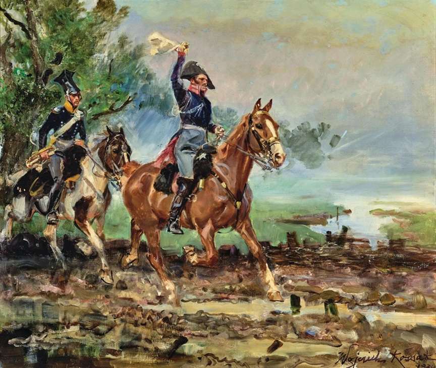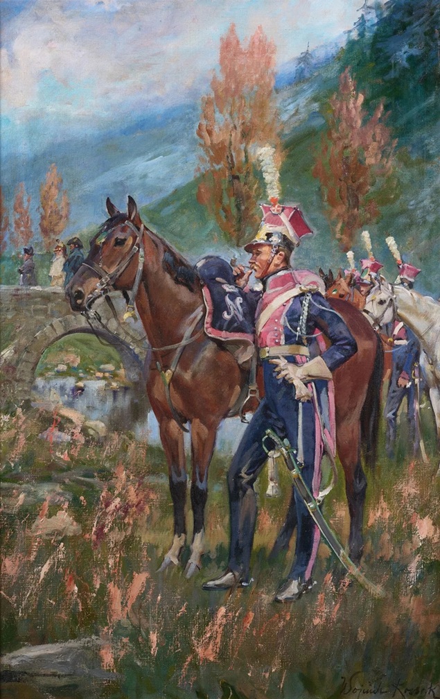 Lot 521. Wojciech (Adalbert) von Kossak (Paris 1857–1942 Krakow). An Uhlan and an officer from the time of the Napoleonic Wars, signed and dated Wojciech Kossak 1930, oil on canvas, 65 × 77 cm, framed. Estimate €13,000 – 22,000. Dorotheum. 04/29/26