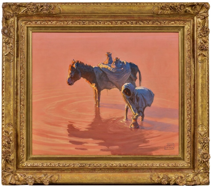 Roztragnieni pracownicy Sotheby’s ‘nie zauważyli’ w opisie proweniencji, że obraz ten został sprzedany niecały rok temu za €8,000: https://polishartcorner.com/2025/06/10/adam-styka-1890-1959-102/. Miał on co prawda inną ramę, lecz to ten sam osiołek pokornie stojący w wodzie a obol Arab nabierający wodę do dzbana. Ten obraz sprzedano najpierw w Sotheby’s za GBP 16,250 a rok temu za pół tamtej ceny. Obraz jest prawdziwy z bardzo dobrą proweniencją. Pozostaje znaleźć miłośnika tej pracy.