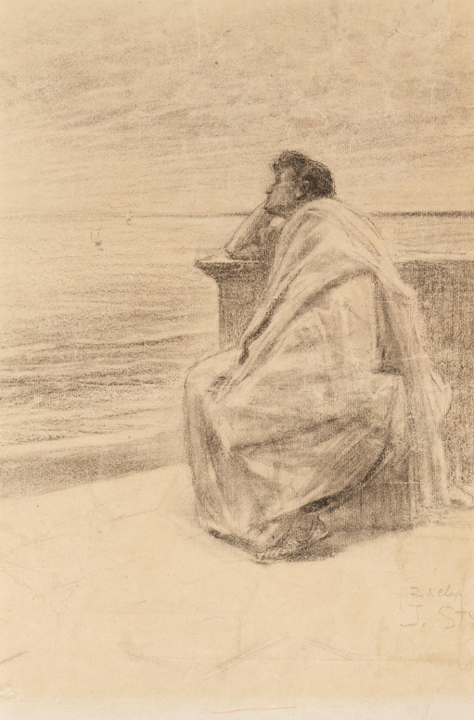 Lot 138-090478/0007. Jan Styka (Lemberg 1858-1925 Rom). Mann am Meeresufer in nachdenklicher Pose, monogrammiert JS, von fremder Hand bezeichnet “J. STYKA”, schwarze Kreide auf Papier, 46,2 x 39 cm, gebräunt (Lichtrand), ohne Rahmen. Provenienz: Privatsammlung, Österreich. Starting €300. Dorotheum. 04/21/26ądny