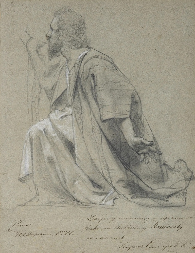 Lot 5. Hendrik Siemiradzki Polish/Russian, 1843-1902. Kneeling Figure, 1881. Signed, dated and inscribed in Cyrillic Paris, 22 April 1881 Dear friend and teacher, Nikolai Andreyevich Koshelev, in memory. Pencil heightened with white chalk on paper; 15 1/2 x 12 inches (39.4 x 30.5 cm). Estimate $800 – 1,200. Doyle. 04/21/26