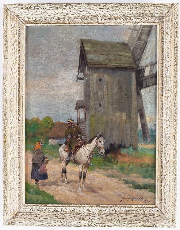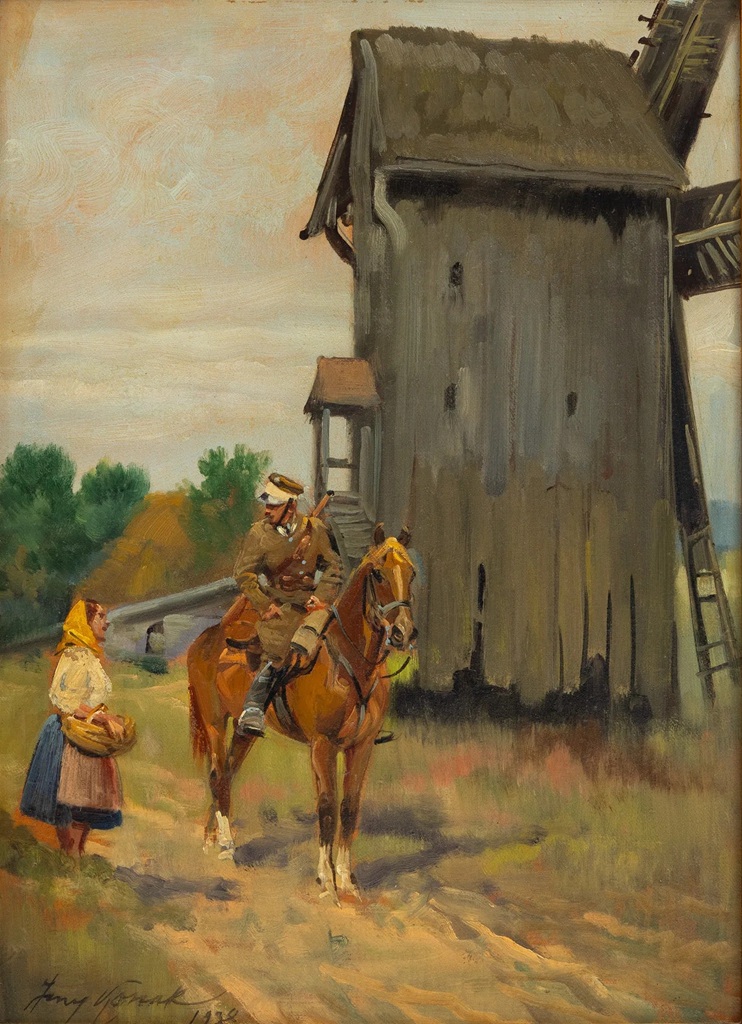 Jerzy Kossak. A soldier on horse back conversing with peasant woman with a distressed mill in the background, 1938