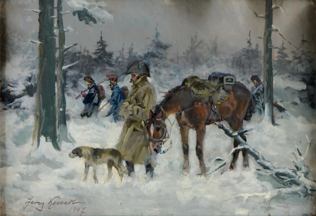 Lot 1374. Kossak, Jerzy 1886 Krakow – 1955 Krakow. Soldiers in winter. Signed. Dated 1947. oil and mixed media, 35 x 47 cm. Opening €300. Dusseldorfer Auktionshaus. 05/09/26