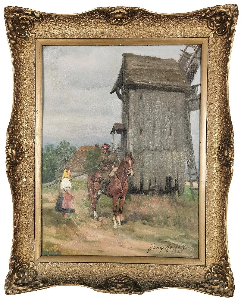 Lot 1113. erzy Kossak (Polish, 1886-1955). Oil on Board 1938, H 15″ W 10.75″. Frame Size: H 21″ W 16.75″. Signed and dated lower left. Depicting a soldier on horse back conversing with peasant woman with a distressed mill in the background. H 15″ W 10.75″ Frame Size: H 21″ W 16.75″. Estimate $300 – 600. DuMouchelles.