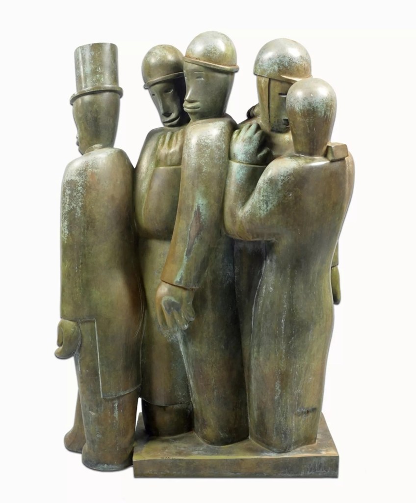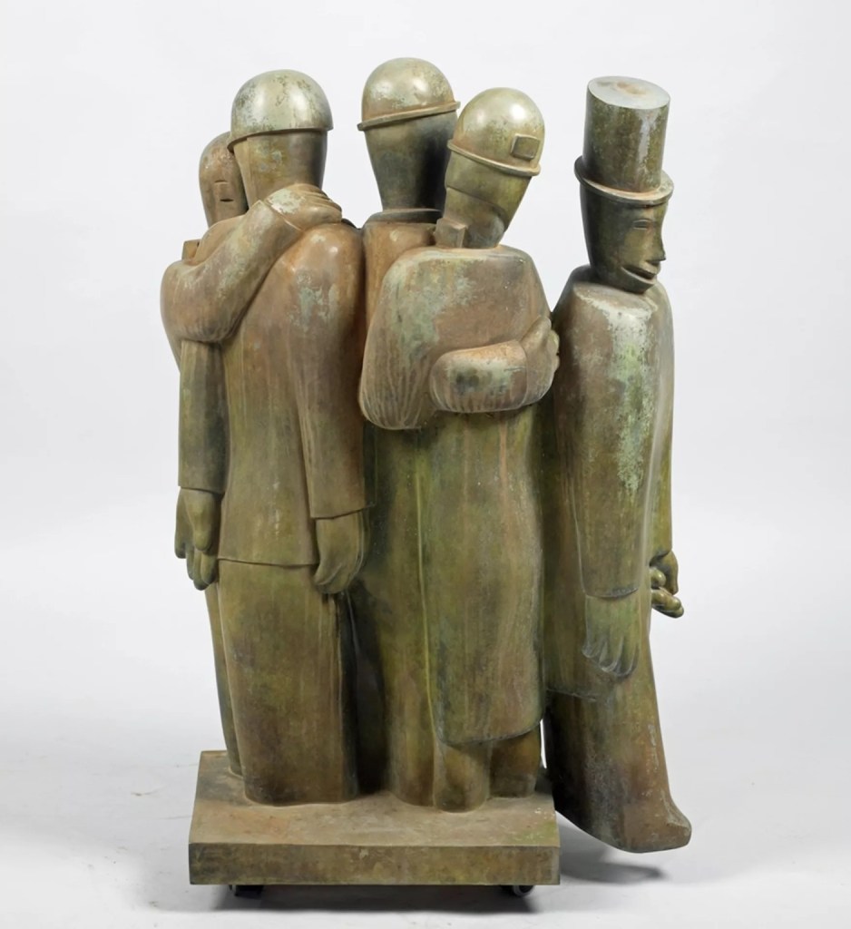 Lot 171. JEAN LAMBERT-RUCKI (1888 Krakau – 1967 Paris). La Foule (Grand modèle), 1923-25. Bronze patiniert. 104 x 67 x 40 cm. Exemplar 1/4 (EA). Rechts auf Plinthe signiert und nummeriert sowie rückseitig Monogramm und Gießereisiegel von Deroyaume. Estimate €12,000. Kunstauktionshaus Leipzig. 04/18/26. Sold €24,000.
