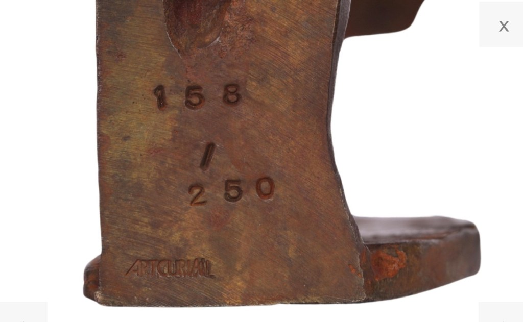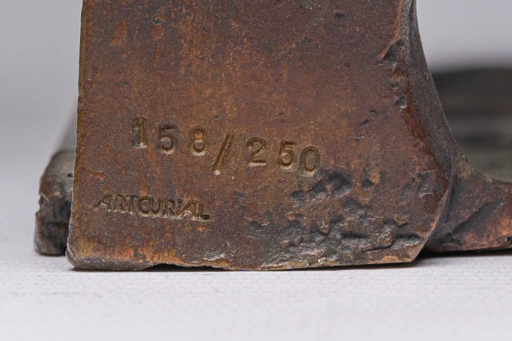 Jak widać, każdy z egzemplarzy posiada numerację 158/250 położoną w różnych miejscach. Dodatkowo warto przyjrzeć się i porównać napis ‘Artcurial‘ na obu rzeźbach.