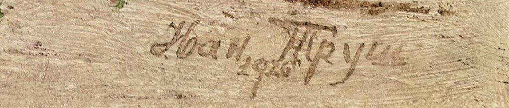 Bardzo dobry pejzaż Iwana Trusza a dodatku nie jest to ‘Przełom Dniestru‘, który był wielokrotnie replikowany. Warto przyjrzeć się tej pracy korzystając z bardzo wysokiej rozdzielczości fotografii udostępnionych przez Dorotheum.