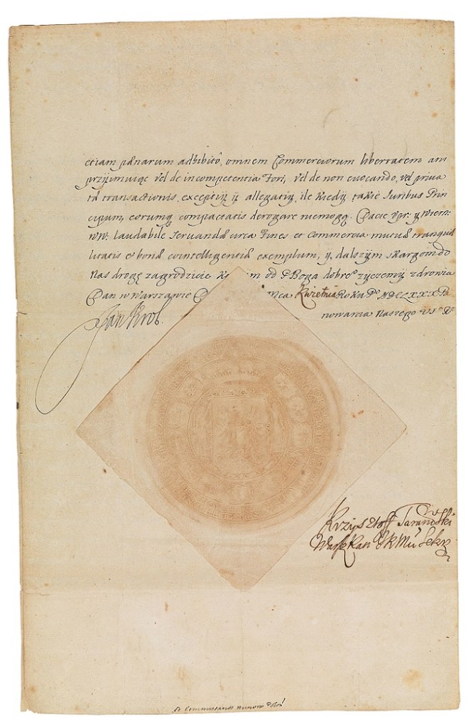 Mandat zur Umsetzung der Beschlüsse des unlängst in Schloss Grodno (Hrodne, Weißrussland) gehaltenen Sejm (polnische Nationalversammlung); betreffend Handelsverträge mit dem Reich und die Klagen des kaiserlichen Gesandten, wonach die Stadt Krakau unter Berufung auf das Lagerrecht der Kaufleute aus Schlesien den Warentransport über die Weichsel verwehrt; weiters mit detaillierten Anweisungen zur Neuordnung der Außenhandelsbeziehungen. Starting 500 euro. Dorotheum. 06/05/20