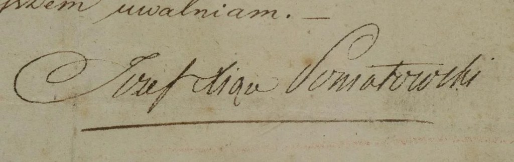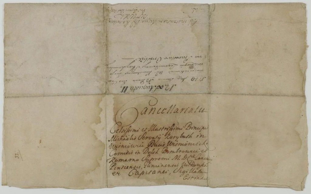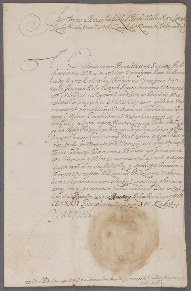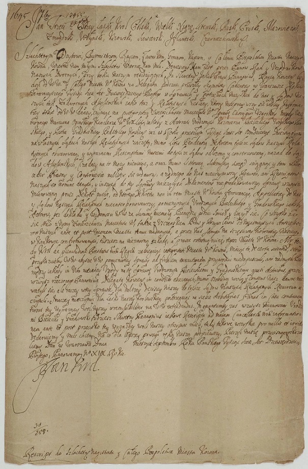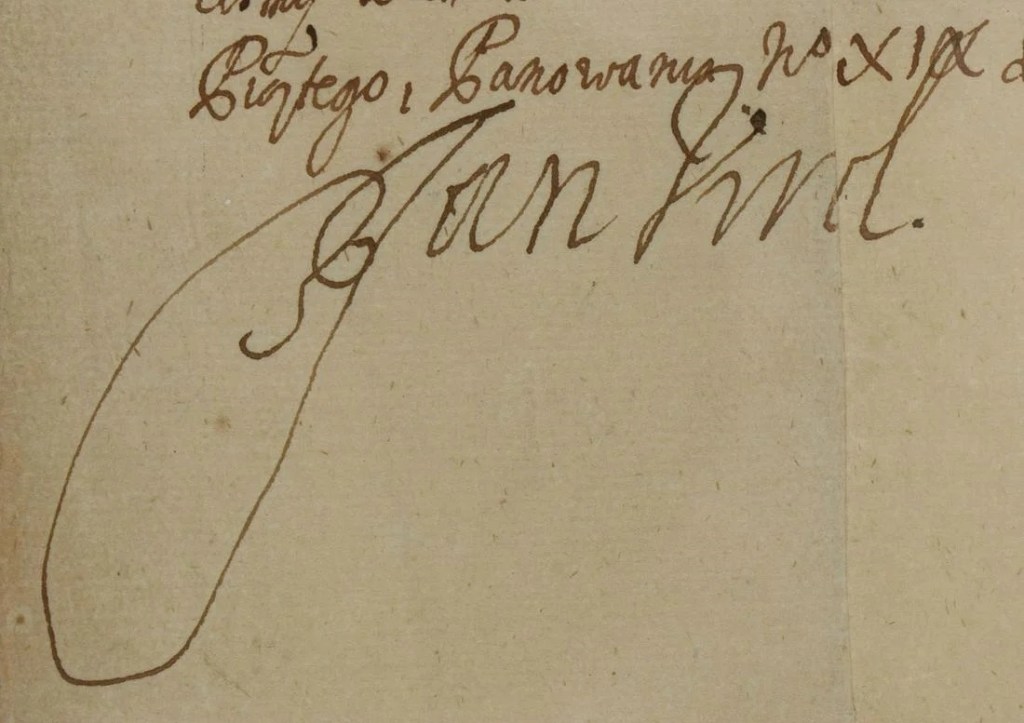 List Jana III Sobieskiego sygnowany Jan Król. List napisany został na niecałe trzy miesiące przed śmiercią. Sygnatura została złożona już nieporadnie, drżącą reką, mocno schorowanego króla. Można porównać do sygnatury autora pisanej pewną reka z 1680 roku z listu sprzedawanego w Dorotheum (powyżej).