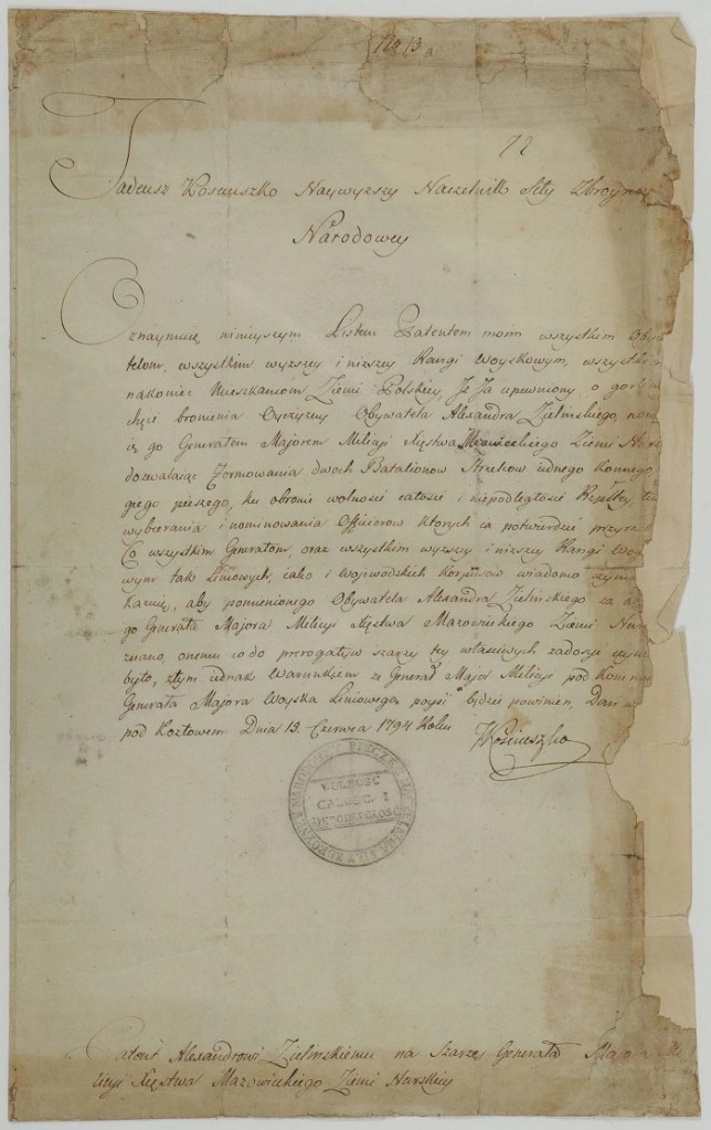 Lot 775. SCARCE TADEUSZ KOSCIUSZKO SIGNED DOCUMENT. The double sheet document of laid paper handwritten in Polish, untranslated, but appearing to be the nomination to General Major of Alexander Ziebinski, dated June 15, 1794, boldly signed T. Kosciuszko. Some loss to right edge, but good bold signature. 15.25 inches x 9.5 inches (39 x 24 cm). Estimate $500 – 750. Jackson’s Auction. 06/24/20. Sold $14,000 (hammer)