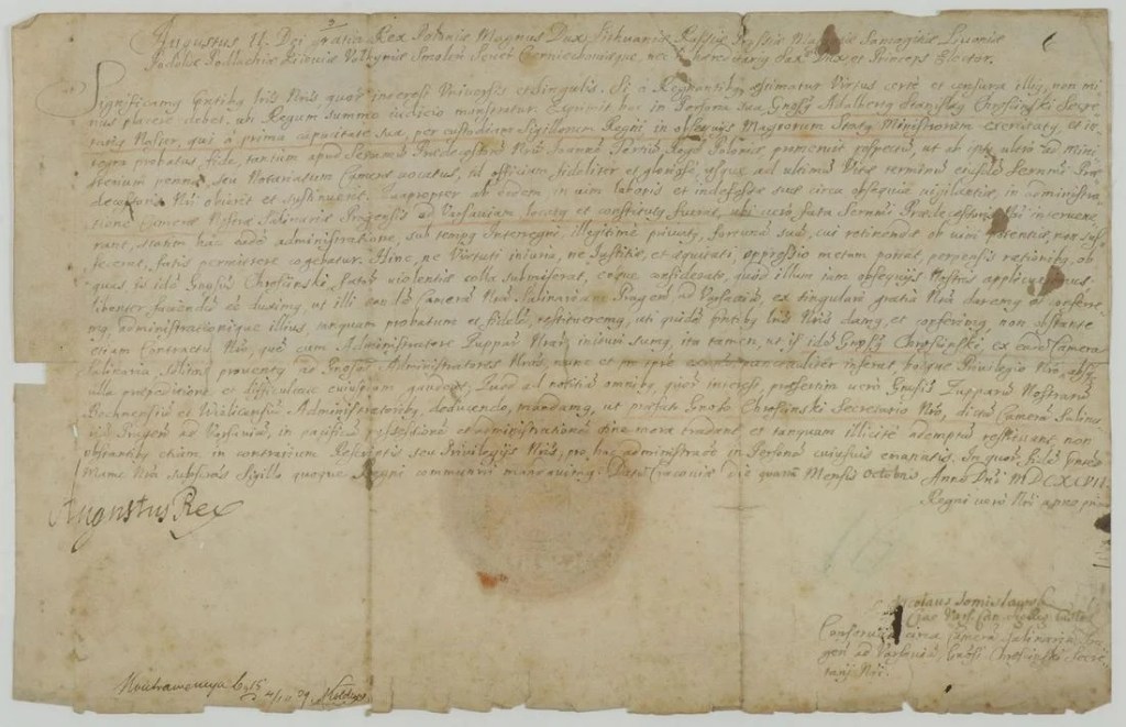 Lot 781. AUGUSTUS II KING OF POLAND SIGNED DOCUMENT. On double sheet of laid paper with coat of arms “Horn” watermark, in Polish, untranslated, boldly signed lower left Augustus Rex, 8 inches x 12.75 inches (20 x 32.5 cm). Provenance: The estate of Michael Albery (1893-1973). To his daughter Ursula Anna Smith née Albery (1922- 2018). Estimate $250- 500. Jackson’s Auction. 06/24/20. Sold $650 (hammer)