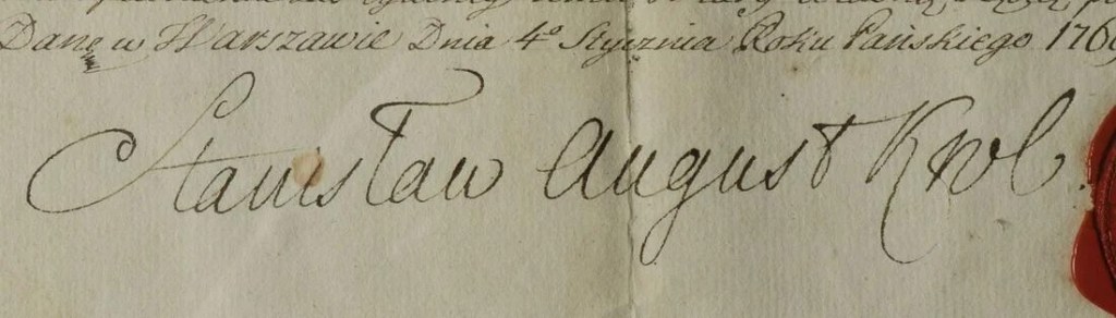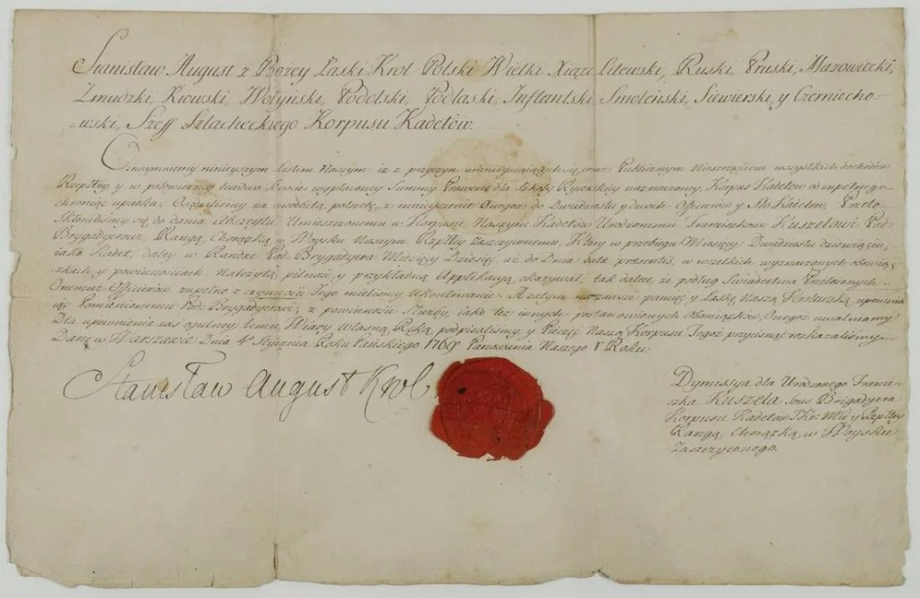 Lot 782. S.A. PONIATOWSKI LAST KING OF POLAND DOC. On double sheet of laid paper in Polish, untranslated, dated January 4, 1769, and related to the dismissal of a student from the Korpus Kadetow (Corps of Cadets). Nice bold signature and red wax seal. Paper with fleur-de-lis watermark. 9.75 inches x 15 inches (24.5 x 38 cm). Estimate $250 – 500. Jackson’s Auction. 06/24/20. Sold $2,200 (hammer)