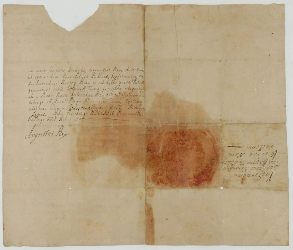 Lot 779. AUGUSTUS II KING OF POLAND SIGNED DOCUMENT. On double sheet of laid paper with Virgin and Child watermark, inscribed in Polish, untranslated, dated Warsaw, July 13, 1725. Boldly signed Augustus Rex and with remnant of large red seal. 13 inches x 15.25 inches (33 x 38.5 cm). Provenance: The estate of Michael Albery (1893-1973). To his daughter Ursula Anna Smith née Albery (1922- 2018). Estimate $250 – 500. Jackson’s Auction. 06/24/20. Sold $900 (hammer)