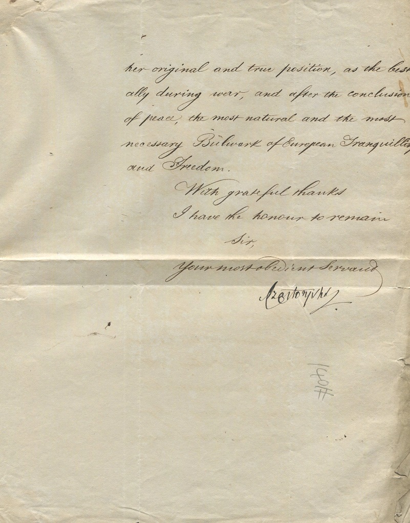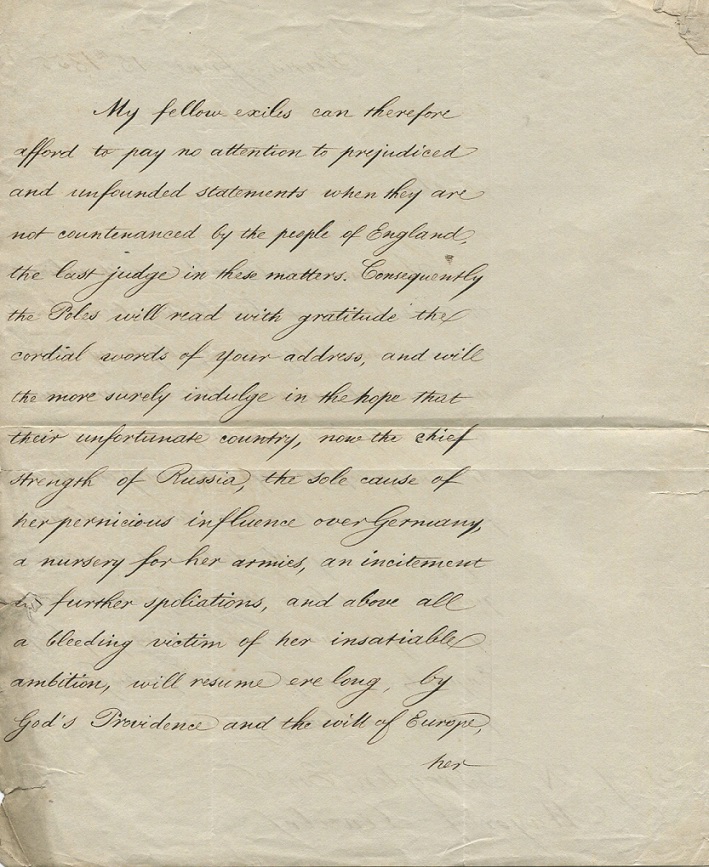 Lot 694. CZARTORYSKI ADAM JERZY: (1770-1861) Polish Nobleman, Statesman, Diplomat & Author. L.S., Czartoryski, three pages, 4to, Paris, 15th June 1855, to Thomas J. N. Brogden, Mayor of Lincoln. Czartoryski commences ‘In answer to the address with which the Inhabitants of Lincoln have been pleased to honour me, I beg thankfully to say that these words of sympathy that reach me now so frequently from different parts of England, are a new proof, perhaps a necessary one at the present moment, that the question of Poland, very often so unjustly dealt with in some quarters, is at least thoroughly understood by the rightminded and thinking people of England’ and continues ‘My fellow exiles can therefore afford to pay no attention to prejudiced and unfounded statements when they are not countenanced by the people of England, the last judge in these matters. Consequently the Poles will read with gratitude the cordial words of your address, and will the more surely indulge in the hope that their unfortunate country, now the chief strength of Russia, the sole cause of her pernicious influence over Germany, a nursery for her armies, an incitement to further spoliations, and above all a bleeding victim of her insatiable ambition, will resume ere long….[and]…..her original and true position, as the best ally during war, and after the conclusion of peace, the most natural and the most necessary Bulwark of European tranquillity and freedom’. A letter of fine patriotic content. Some light creasing, dust staining, small tears and a few minor paper losses to the edges, only very slightly affecting the text but not the signature, G Thomas J. N. Brogden (1814-1880) English Bookseller and Newspaper owner, Mayor of Lincoln 1855 & 1879. Czartoryski began his political career as a foreign minister to Tsar Alexander I of Russia, although later became a leader of the Polish government in exile and a bitter opponent of Tsar Nicholas I. Estimate €600 – €900. International Autograph Auction Europe. 07/23/20