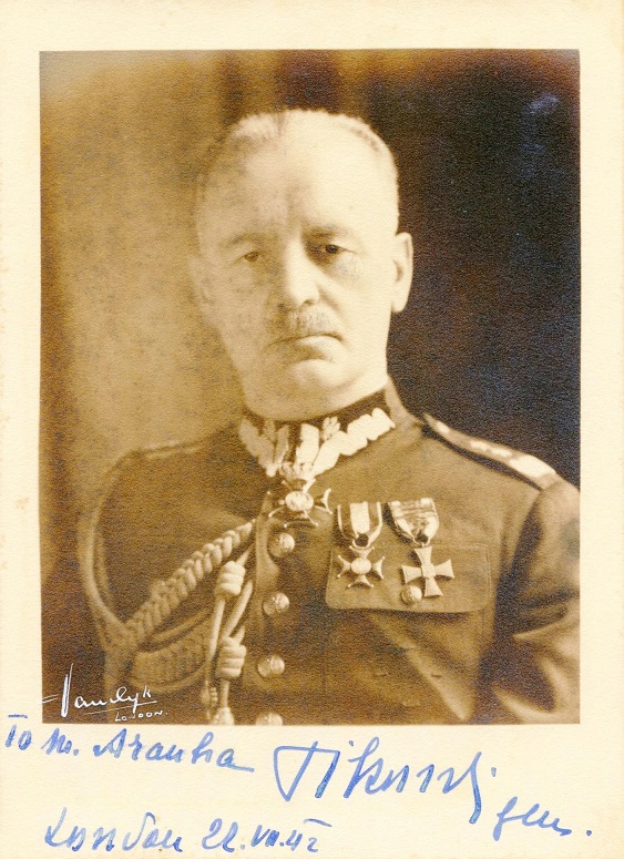 Lot 769. SIKORSKI WLADYSLAW: (1881-1943) Polish military and political leading figure who promoted the cause of the independence of Poland from the Russian Empire. He served as Prime Minister of Poland 1922-23, and of the Polish government in exile during WWII. Sikorski died in a plane crash, the circumstances of the accident still remaining unclear. A very good signed and inscribed 5 x 7 photograph, the Vandyk image showing Sikorski in a head and shoulders pose, wearing his military uniform and decorations. Signed in bold blue ink to the lower white border `Sikorski´, in Polish, and dated beneath `London 22nd July 1942´ in his hand. Bearing to the verso an ink stamp of the London Photographer Vandyk, 41, Buckingham Palace Road. Signed portraits of Sikorsky are rare in any form. Very small age ear and toning, otherwise G Sikorski visited the England and the United States in 1942 looking for the allies support and pleading in favour of his invaded homeland. In his speeches he would say `The Polish Armed Forces have been fighting, are fighting and shall continue to fight on land, on sea and in the air, wherever the military forces of Germany can be destroyed.´. Estimate 1,200 – 1,800 euro. International Autograph Auction Europe. 07/23/20