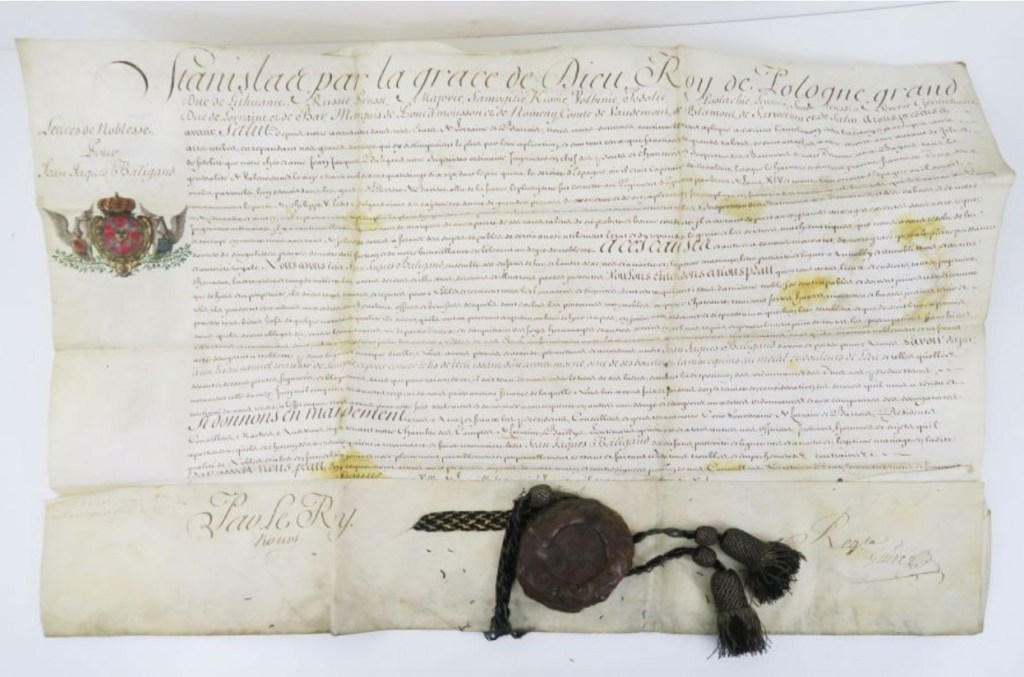 List Stanisława Leszczyńskiego z roku 1756 nadający szlachectwo jakiemuś Francuzowi. Dokument jest drogo wyceniony i być może jest mało atrakcyjny dla polskiego kolekcjonera z powodu, że Leszczyński już nie był królem Polski (choć zachował ten tytul dożywotnio). De-facto, Leszczyński rezydując wtedy we Francji, był księciem Lotaryngii i Baru.