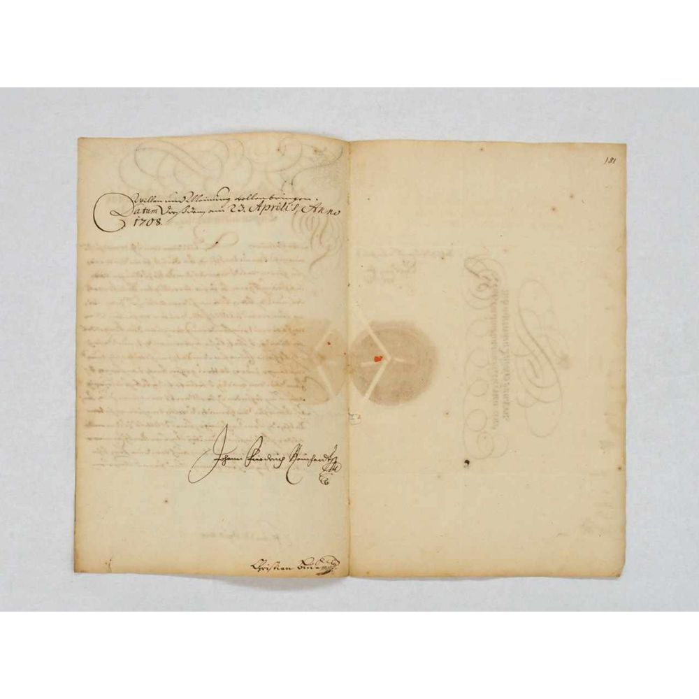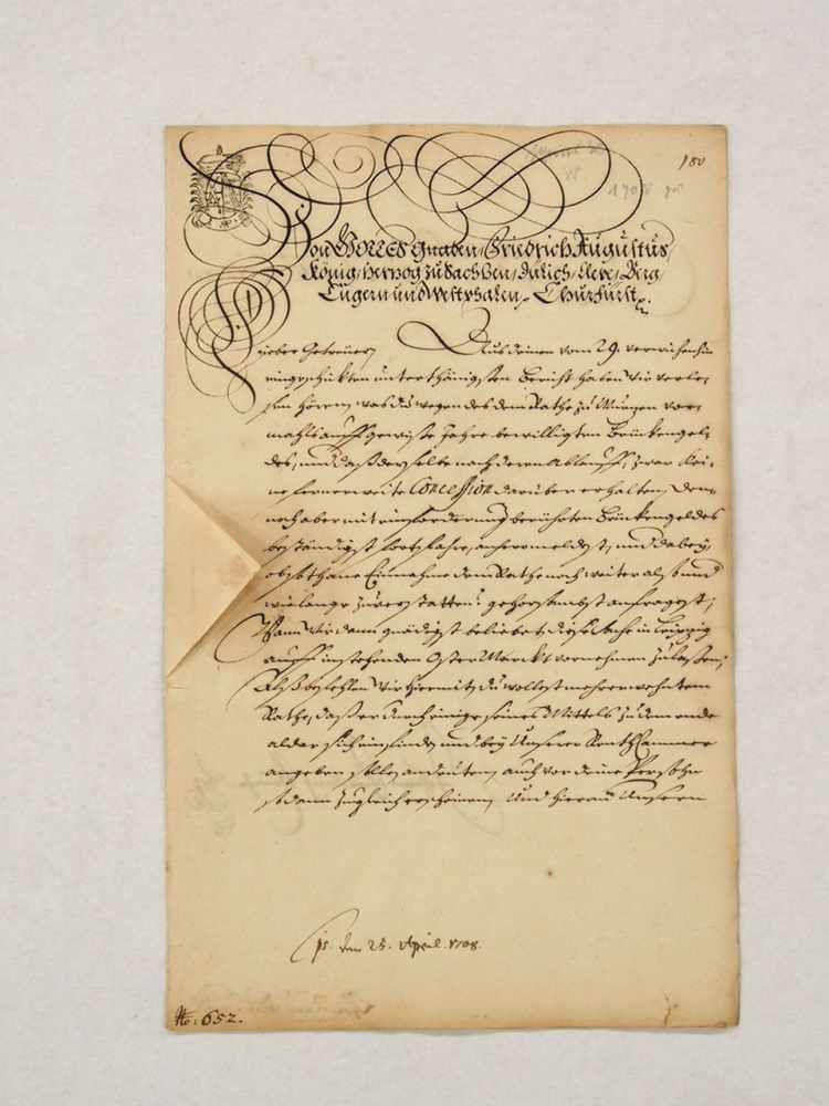Lot 63. Brief von Friedrich August, König von Polen, Herzog zu Sachsen, Jülich, Cleve, Berg, Engern und Westfalen vom 23.4.1708 an Rudolph Jünger, Amtmann zu Wurtzen, Handschrift auf Papier, mit Blindstempel, 33 x 20 cm. Reserve 150 euro. Auktionshaus Dr. Eder. 09/26/20. Sold 340 euro