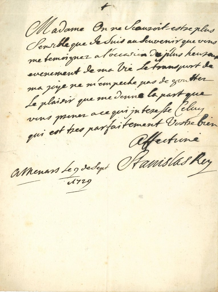 Lot 636. STANISLAS LESZCZYNSKI (1677-1766) King of Poland, Duke of Lorraine, father of Queen Mary Leszczynska. L.A.S., Menars 9 September 1729, to a lady; 3 / 4 page in-4. Birth of his grandson the Dauphin Louis (4 September 1729-1765, father of Louis XVI, Louis XVIII and Charles X).