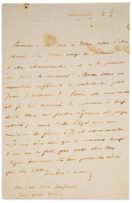 “How nice it is for your living room to be warm – for your Nohant snow to be charming – and for youth to do carnival! – Do you have a sufficient repertoire of contrasts to make the orchestra? BORIE has come to see me and I will send her the piece of cloth you are talking about. – Grzym [Albert GRZYMALA] is almost well; – but here comes PLEYEL with a recurrence of fever. He has become invisible. – I’m glad the bad weather here is not affecting you. Be happy and well and so are yours. Your all devoted Ch “…