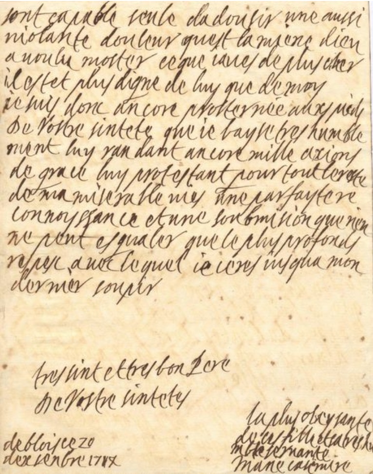 Lot 807. MARIE CASIMIRE QUEEN OF POLAND: (1641-1716) Marie Casimire Louise de la Grange d´Arquien, also known as Marysienka. Queen consort of Poland 1676-96, as spouse of King John III Sobieski, and Grand Duchess of Lithuania. Extremely rare A.L.S., `La plus obéissante de ses filles et sa tres humble servante. Marie Casimire´, three pages, 4to, n.p. [France], n.d. [November 1714 – early 1715], to the Pope, in French. A lengthy letter in the Queen´s hand, in an often ”written as it sounds” French. Marie Casimire thanks his Holiness for the help given and blessings to her son who has passed away, stating in part `..the expressions of goodness shown by your Holiness, honouring my dear child all along his illness, and the distinction awarded after his death, cruel word for me to pronounce..´ With provenance from Morrison collection. Small professional repair to the fold, otherwise VG Clement XI (1649-1721) Born Giovanni Albani, Pope of the Catholic Church and Ruler of the Papal States 1700-21. Correspondent of Marie Casimire in the present letter. The Queen refers to her son Alexander Stanislaw Sobieski (1677-1714) Polish Prince, diplomat and scholar. Son of John III Sobieski, King of Poland. Alexander was a candidate for election to the Polish throne in 1697, following his father’s death, but was unsuccessful. He died at the early age of 37 in Rome, in 1714, having recently become a Capuchin friar. Estimate 2,000 – 3,000 euro. International Autpgraphs. 12/03/20