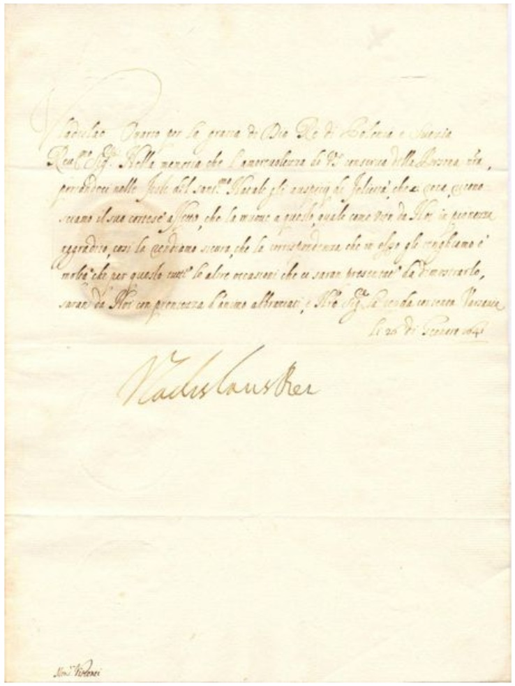 Lot 806. WLADYSLAW IV VASA: (1595-1648) King of Poland 1632-48. A renowned Patron of the Arts. Wladyslaw gained fame when he defeated the Ottoman Empire and was elected Tsar of Russia by the Seven Boyars in 1610, although he did not accept the Russian throne. Rare L.S., `Vladislaus Rex´, one page, 4to, Warsaw, 20th January 1641, to Monsignor Honorato Visconti, Archbishop Larissano, in Italian. The King of Poland thanks his correspondent for his good wishes and sends his greetings on this Christmas occasion, stating in part `..Vladislao fourth by the grace of God, King of Poland and Sweden… we recognize your courteous affection which you deeply forward…´ Bearing the Wladyslaw attractive Royal paper seal affixed to the verso address leaf, in very fine condition. Estimate 1,500 – 2,000 euro. International Autographs. 12/03/20