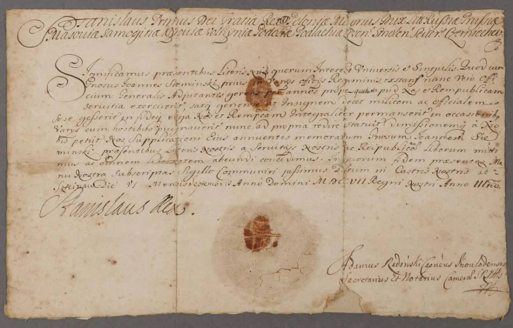 Lot 228. RARE POLISH DOCUMENT STANISLAW LESZCZYNSKI. On double sheet of laid paper with royal seal: coat of arms of Poland and Lithuania with Leszcynski “Wieniwawa” coat at center, dated September 6, 1707, inscribed in Polish, untranslated, boldly signed “Stanislaus Rex.” lower left, 8 inches x 12.8 inches (20.5 x 32.5 cm). Estimate $300 – 400. Jackson’s. 07/13/21