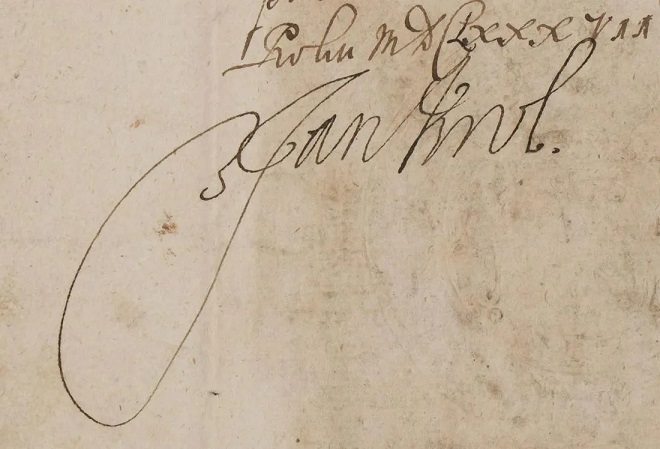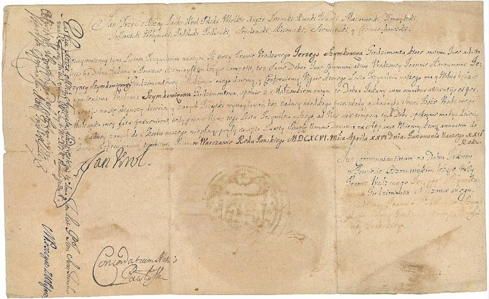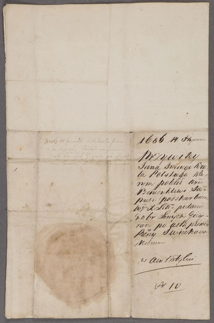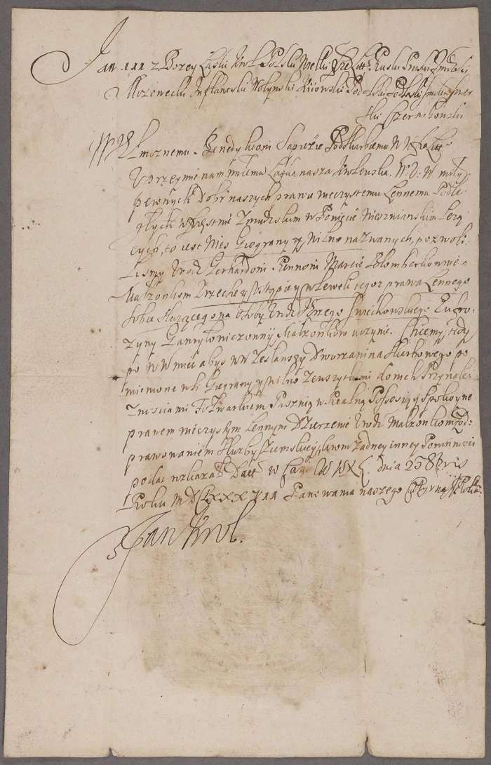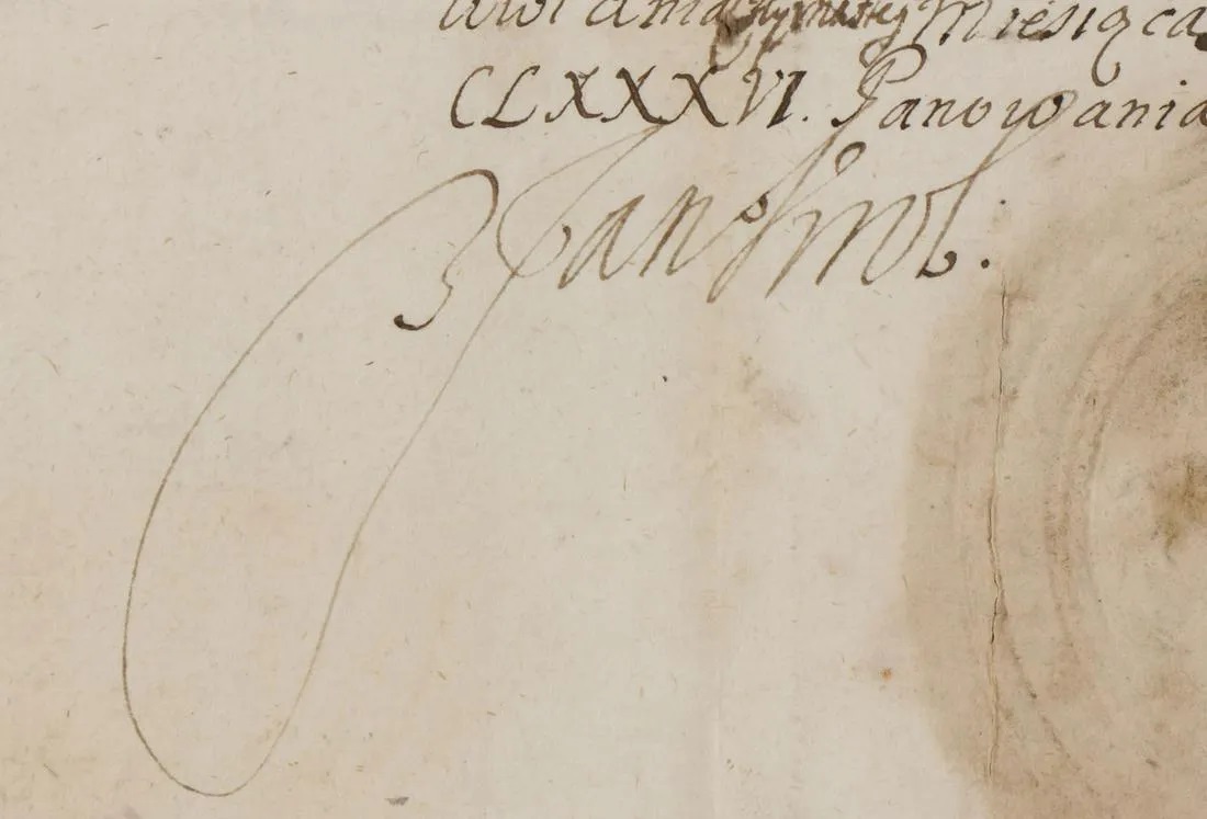 List Jana III Sobieskiego sygnowany Jan Król. List napisany został na niecałe trzy miesiące przed śmiercią. Sygnatura została złożona już nieporadnie, drżącą reką, mocno schorowanego króla. Można porównać do sygnatury autora pisanej pewną reka z 1680 roku z listu sprzedawanego w Dorotheum (powyżej).